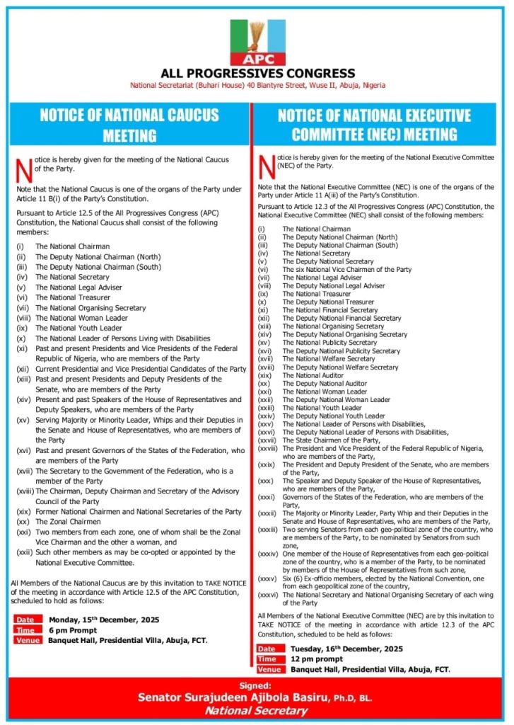 According to the notice, the National Caucus meeting will hold on Monday, December 15, 2025, at 6:00 p.m., while the NEC meeting is scheduled for Tuesday, December 16, 2025, at 12:00 noon. Both meetings will take place at the Banquet Hall of the Presidential Villa, Abuja.